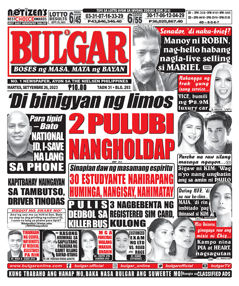 Bulgar Digital, September 26, 2023BULGARSep 26, 2023Alamin at basahin ang mga #headlines sa pahayagan ng Bulgar ngayong September 26, 2023.#bulgar #Bulgaronline #headlines2023 #NewsHeadlines #bulgarnews #frontpage #frontpagenews #tabloidnewspapers #Tabloid