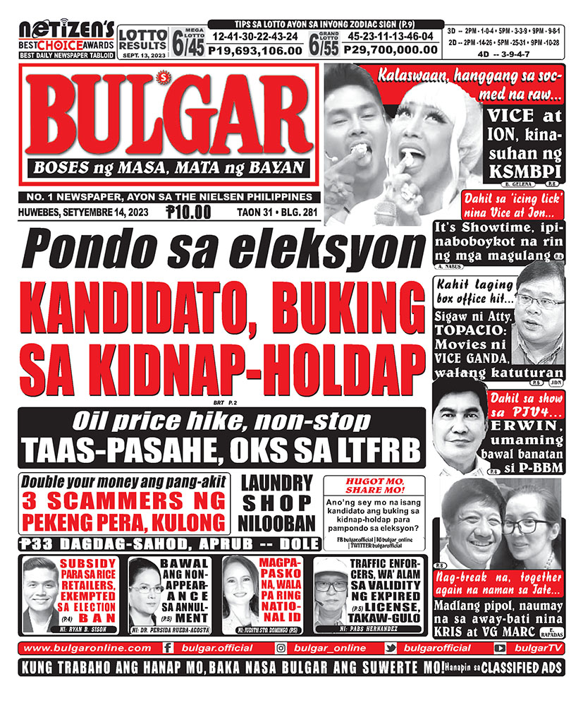 Bulgar Digital, September 14, 2023BULGARSep 14, 2023Alamin at basahin ang mga #headlines sa pahayagan ng Bulgar ngayong September 14, 2023.#bulgar #Bulgaronline #headlines2023 #NewsHeadlines #bulgarnews #frontpage #frontpagenews #tabloidnewspapers #Tabloid