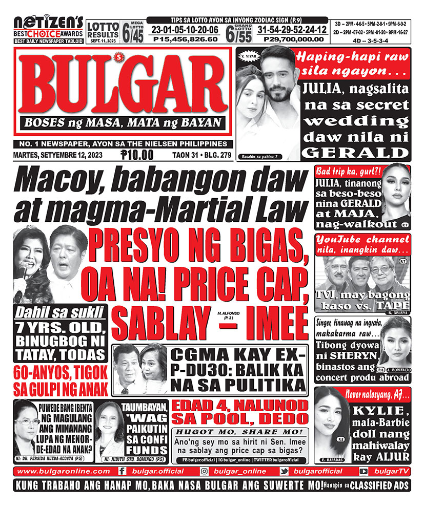 Bulgar Digital, September 12, 2023BULGARSep 12, 2023Alamin at basahin ang mga #headlines sa pahayagan ng Bulgar ngayong September 12, 2023.#bulgar #Bulgaronline #headlines2023 #NewsHeadlines #bulgarnews #frontpage #frontpagenews #tabloidnewspapers #Tabloid