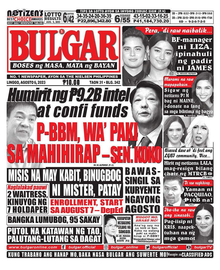 Bulgar Digital, August 6, 2023BULGARAug 6, 2023Alamin at basahin ang mga #headlines sa pahayagan ng Bulgar ngayong August 6, 2023.#bulgar #Bulgaronline #headlines2023 #NewsHeadlines #bulgarnews #frontpage #frontpagenews #tabloidnewspapers #Tabloid