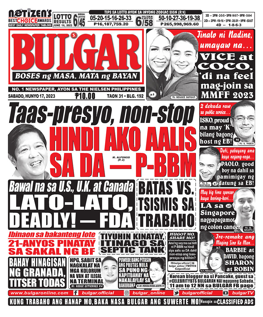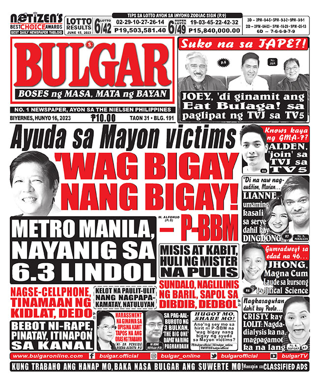 Bulgar Digital, June 15, 2023BULGARJun 15, 2023Alamin at basahin ang mga #headlines sa pahayagan ng Bulgar ngayong June 15, 2023.#bulgar #Bulgaronline #headlines2023 #NewsHeadlines #bulgarnews #frontpage #frontpagenews #tabloidnewspapers #Tabloid