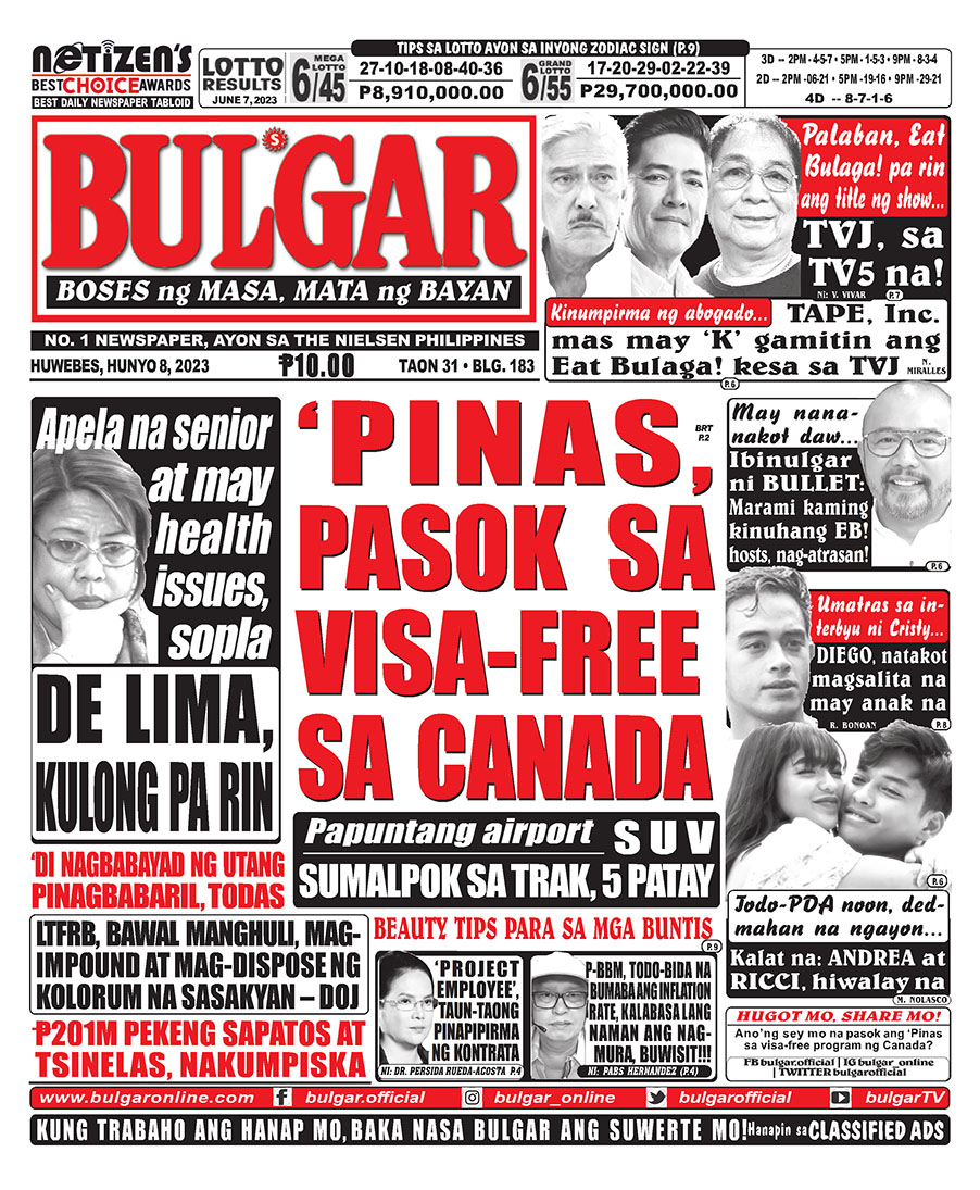 Bulgar Digital, June 8, 2023BULGARJun 8, 2023Alamin at basahin ang mga #headlines sa pahayagan ng Bulgar ngayong June 8, 2023.#bulgar #Bulgaronline #headlines2023 #NewsHeadlines #bulgarnews #frontpage #frontpagenews #tabloidnewspapers #Tabloid