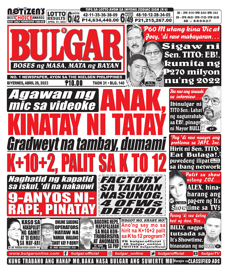 Bulgar Digital, April 28, 2023BULGARApr 28, 2023Alamin at basahin ang mga #headlines sa pahayagan ng Bulgar ngayong April 28, 2023.#bulgar #Bulgaronline #headlines2023 #NewsHeadlines #bulgarnews #frontpage #frontpagenews #tabloidnewspapers #Tabloid