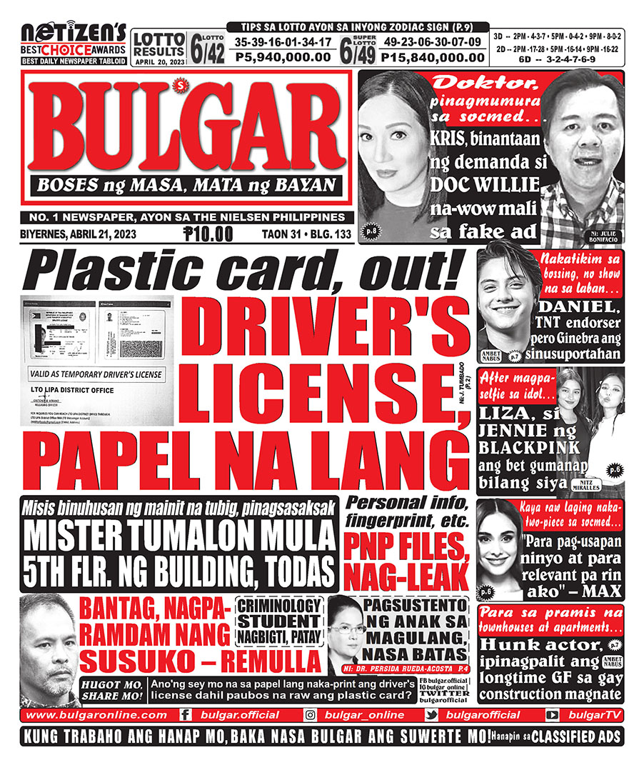Bulgar Digital, April 21, 2023BULGARApr 21, 2023Alamin at basahin ang mga #headlines sa pahayagan ng Bulgar ngayong April 21, 2023.#bulgar #Bulgaronline #headlines2023 #NewsHeadlines #bulgarnews #frontpage #frontpagenews #tabloidnewspapers #Tabloid