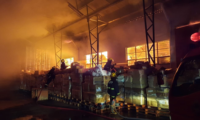Dalawang bumbero ang sugatan sa pagresponde sa nasunog na warehouse sa Tandang Sora, Ave. Barangay Sangandaan, Quezon City pasado alas-11 nang gabi nu'ng Miyerkules, Pebrero 24.
