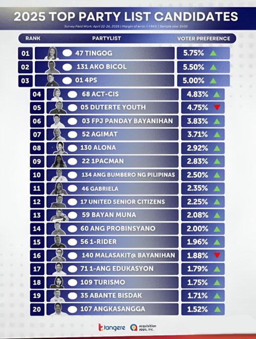 Former Senator Tito Sotto, statistically tied at 4-5, with a 46.50% voter preference; Senator Pia Cayetano, statistically tied at 6-9, with a 41.6% voter preference; Senator Bong Revilla Jr., statistically tied at 6-9, with a 41.0% voter preference; Former DILG Secretary Ben Abalos, statistically tied at 6-10, with a 40.7% voter preference after posting a notable increase from Southern Luzon and Bicol Region; Senator Lito Lapid, statistically tied at 6-10, with a 40.0% voter preference; Former Senator Ping Lacson, statistically tied at 8-10, with a 39.0% voter preference; Senator Francis Tolentino, statistically tied at 11-17, with a 34.3% voter preference; Former Senator Manny Pacquiao, statistically tied at 11-17, with a 34.0% voter preference; Makati Mayor Abby Binay, statistically tied at 11-18, with a 33.8% voter preference; and Alyansa guest candidate, Cong. Camille Villar, statistically tied at 11-18, with a 33.5% voter preference. Independent Candidates Cong. Erwin Tulfo’s brother, Media Executive Ben "Bitag" Tulfo, ranked 4th-5th with a 46.2% voter preference driven by Metro Manila, Visayas, and Mindanao votes. Former Senator Bam Aquino, ranked 11th overall all (statistical 11-16) with a voter preference of 34.9%. Completing the top 20 will be Incumbent Senator Imee Marcos, ranked 12th to 19th with a 32.5% voter preference. ----------------------------