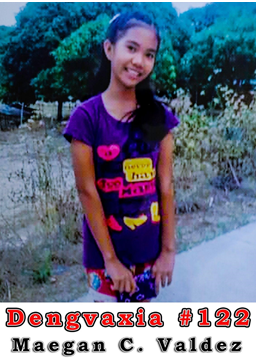 Si Maegan, 13, namatay noong Marso 1, 2019, ang ika-122 sa mga naturukan ng Dengvaxia na under Clinical Trial Phase 3 (WHO, Peter Smith) at nakaranas ng sintomas na kasama sa common pattern of four serious adverse effects (anaphylactic allergic reaction, viscerotropism (pamamaga, paglaki at pagdurugo ng laman-loob), neurotropism (pamamaga at pagdurugo ng utak), and increase in severity of dengue disease) na sumasang-ayon sa Sanofi Declaration of Four (4) Identified and Expected Risks in its Submission for Authorization sa Food and Drug Administration (FDA) {22 Disyembre 2015} - na sumailalim sa forensic examination ng PAO Forensic Team, pagkatapos hilingin ng kanilang mga pamilya.